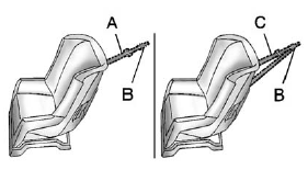 The child restraint may have a single tether (A) or a dual tether (C). Either will have a single attachment (B) to secure the top tether to the anchor.